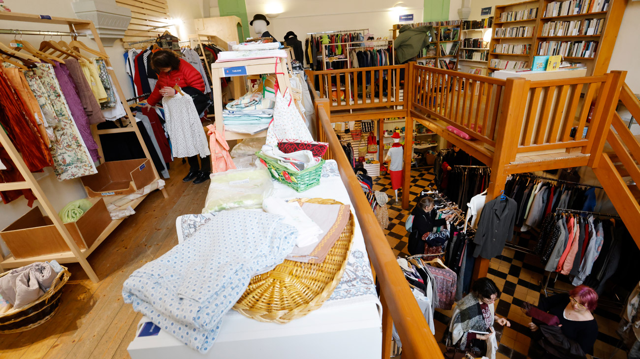 Antre de la seconde main, la friperie brocante des Invités au Festin (IAF) a été entièrement réaménagée au sein de la Maison des Sources. L’espace de 100m² a gagné en luminosité et en fluidité de circulation. Plutôt que dans le joyeux bric-à-brac ouvert en décembre 2001, le chaland évolue depuis février dans une véritable boutique, avec portants, présentoirs et îlots thématiques. Là vêtements femme, ici jouets, ailleurs coin livres, rayons vaisselle, petit électroménager ou déco.