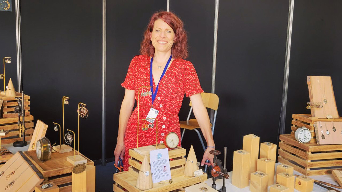 Prisca Van Paassen s’est intéressée à l’horlogerie après son arrivée à Besançon, capitale du temps. « J’ai pu découvrir que l’horlogerie était un aspect très prégnant dans la région et je suis tout de suite tombée sous le charme. J’adore cet univers. Tout ce qui se réfère aussi à l’engrenage, au temps qui passe… » explique-t-elle. La vie a fait qu’elle s’est tournée vers la création de bijoux en parallèle de son travail à l’Ademe, des créations fabriquées avec d’anciennes pièces horlogères : mécanismes, engrenages, cadrans… Et il y a eu un déclencheur : « c’est un cadeau que m’a fait mon père. Il m’avait fabriqué un collier avec une de ses anciennes montres, il avait utilisé le vieux mécanisme sur lequel il avait collé un pin’s pour en faire un collier » raconte Prisca.
