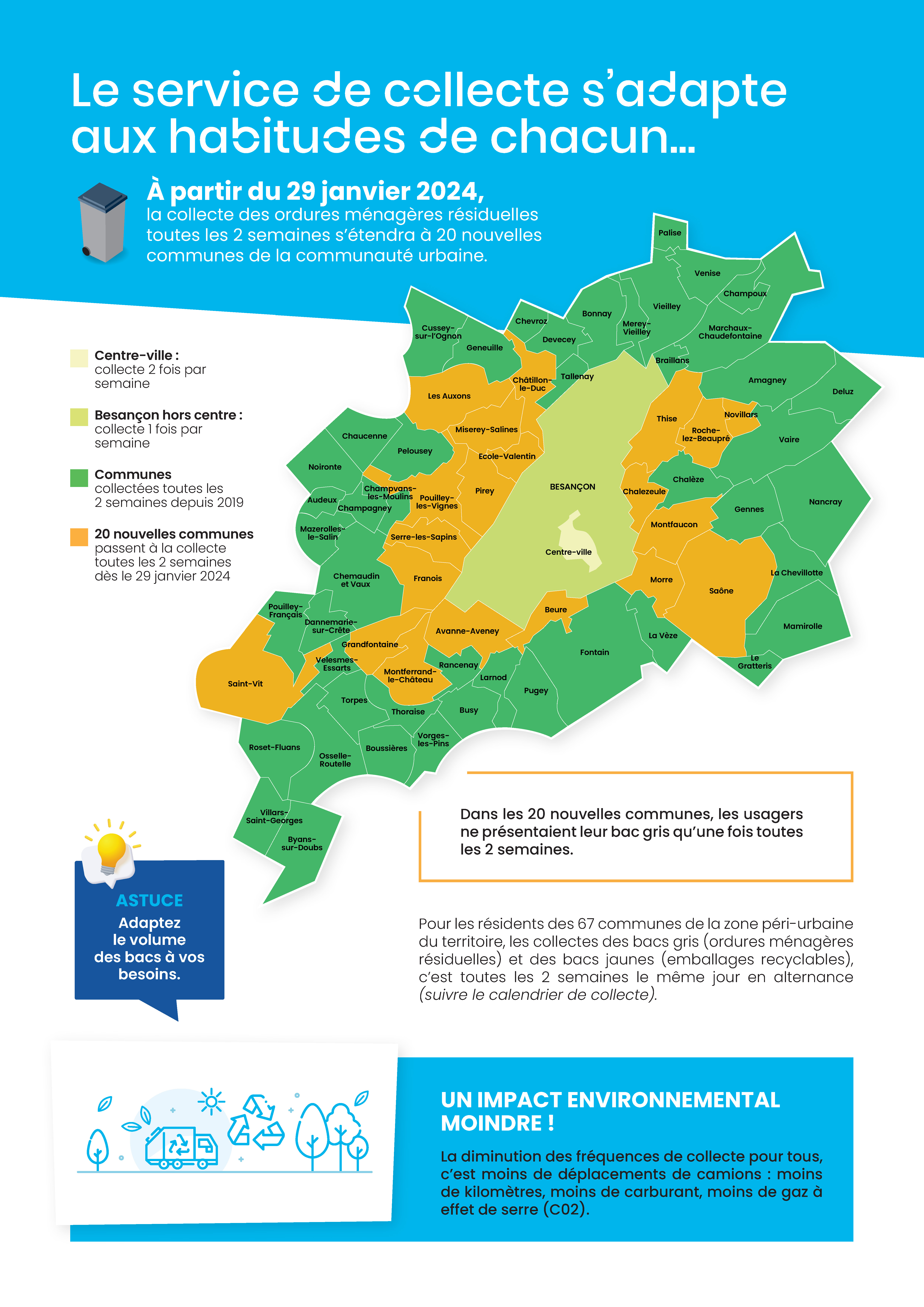C’est pourquoi à partir du 29 janvier 2024, les fréquences de collecte s’harmonisent sur les communes péri-urbaines de Grand Besançon Métropole. La collecte des déchets résiduels y sera désormais assurée toutes les deux semaines en alternance avec la collecte des emballages recyclables. L’expérience des communes du territoire pour lesquelles ces fréquences de collecte sont déjà appliquées depuis 2019 conforte dans l’adoption par tous de ce nouveau rythme.