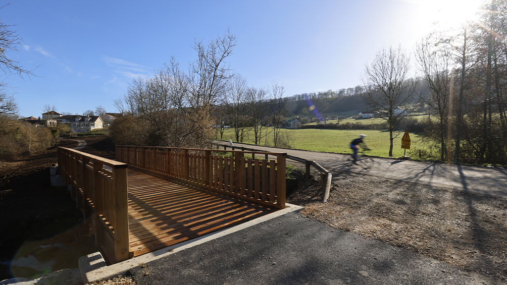Situé dans une zone protégée par un Arrêté Préfectoral de Protection de Biotope, assorti d’un classement ZNIEFF* pour le ruisseau de Busy, le projet a nécessité une étude écologique afin de ne pas impacter le ruisseau et ses abords. Pour l’enjamber, il a fallu créer une passerelle. Longue de 15 mètres et large de 3 mètres, celle-ci a été réalisée au moyen d’une structure métallique avec un platelage et des garde-corps en bois, pour un coût global de 310 600 €. Les plantations ont été réalisées en février, l’engazonnement et les marquages au sol sont prévus au printemps, dès que la météo le permettra.