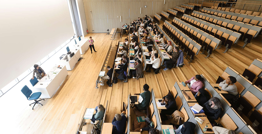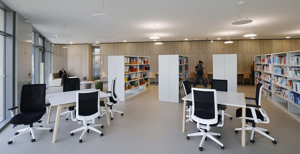 Quant à l’acoustique, elle a été particulièrement soignée dans les espaces de formation, notamment les amphithéâtres, grâce à l’utilisation de matériaux comme le bois, optimisant ainsi le confort sonore. La conception structurelle du bâtiment, avec des murs en panneaux de bois et une isolation vibratoire, garantit également une réduction des nuisances sonores provenant de la ligne de tramway adjacente.