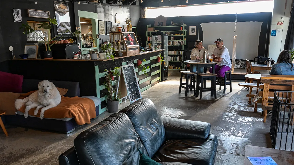Jeudi après-midi, jour de tempête. Dehors, les chaises s’envolent, tandis qu’à l’intérieur, le calme règne. Une musique douce joue en fond, le poêle à bois crépite et une tasse de café fumant réchauffe les mains. Cet ancien hangar réaménagé n’est pas seulement un refuge pour humains en quête de capuccino, c’est également un lieu de vie pour chiens et sportifs.